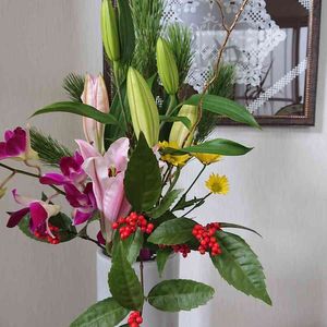 玄関に お正月生け花 飾りました😀ありきたりな植材で 余りにも普通になってしまいましたが 華やかになったので よし🙆ということで 勝手に納得😅 一年間 お世話になりました🙇 沢山のいいね👍️や コメントを 下さって 毎日 楽しい日々でした⤴️⤴️⤴️🥰 来年も 変わらず よろしくお願いしますm(_ _)m