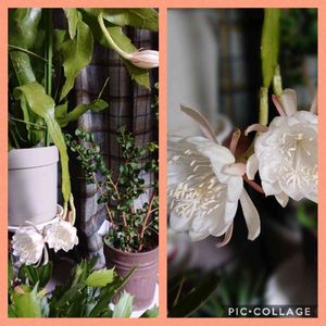 姫月下美人 その2 先ほどから 2時間後🤗満開😀 上↗️の1輪は 下より少し遅れて 咲きました🎵 下↘️の2輪は 同じ葉っぱの先に2輪が ついているせいか 上↗️の1輪だけの方が 花が 大きいですね❤️ 3輪同時だと 部屋中 ほんのり いい香りが 漂ってます🥰
