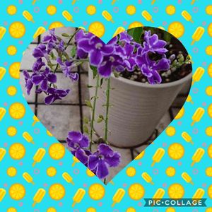 2年目のデュランタ😀 茎が 四方八方に伸びた先に それぞれ 花が咲いてます🎵⤴️😀 わかりやすいように 1枝だけのアップです🎵😍🎵 去年の姿のように まとまって咲かすのは どうしたらいいのだろう❔🤔 少しでも 涼しく アイスキャンディを バックにしてみました(笑)