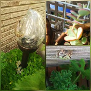 上:みどりんジェームス🐸さん 🐸『あっちの庭もいいなー』 え? 行っちゃうの?😳💦💦💦 下:ゴマジェームス🐸さん 日が高くなったら美白してました😳💦 多肉も暑さに耐えれる物は白い粉をまとったようになるじゃないですか? 🐸も白くして熱を弾くようにしてるんですかね?🤔💦 そして、まん丸だし🤭❤️