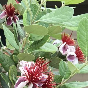 フェイジョア咲きました💕😍 2年前お迎えしたときは鉢植えに💦 でも大きさが限界点に達し去年 地植えに😅(サイショカラソウシヨウネ) 雑にゴリゴリと地面にねじ込みましたが(笑) 初めての花を見せてくれました𖤣𖥧𖥣。 なんて情熱的でエキゾチック💕 ウキウキするような花です なんでも・・食べられる花と😍 そして実もなるのだと𓂃 𓈒𓏸𑁍 鳥さんに食べられないように パトロール強化です😆