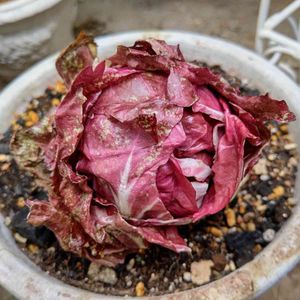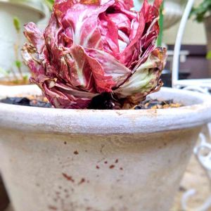 ~強風で~ 傾き加減のトレビス 外葉は枯れて全て吹き飛ばされました。 鉢が小さすぎて植え替え必須なのですが、これ以上大きくすると日当たりが良い場所には置けない、、、となります。悩みますね。