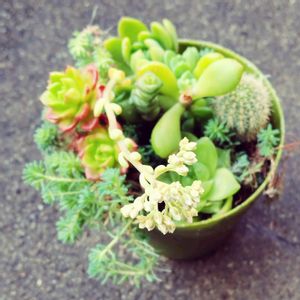 簡易温室の中で冬越しをした、多肉の寄せ植えに花が咲きそうです🌿🤍