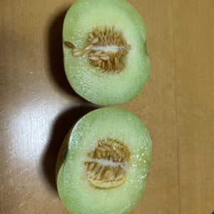 軒下で過保護栽培していたころたん🍈 先日の大雨の日、鉢が移動していて雨ざらし状態(犯人は主人💢) なかなか自然落下せずに気になっていたら翌日触るとポトンと落下…雨の影響なのか自然落下なのか… 数日置くも柔らかくなる気配も無い、匂いもしない… 重さは平均をクリア!待ちきれずカット🔪 ちゃんと🍈🙌 めちゃくちゃ甘いわけではないけど、ほんのり甘くちゃんとメロンの味がしました🤗 もう少し我慢できたら良かったかも(⌒-⌒; )