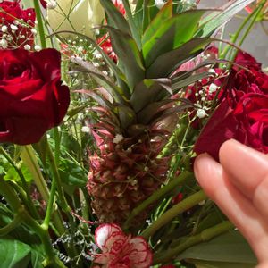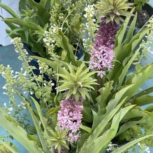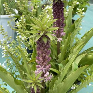 パイナップルリリー ユリ科ユーコミス属 多年草 別名はユーコミス、星万年青(ホシオモト) 南アフリカ原産 ユーコミスとはギリシャ語で「美しい頭の毛」という意味である。 草丈40〜80cm 太い花茎を真っ直ぐに伸ばし、花茎の上部に多数の小花を咲かせる。 花は直径2cm前後で、6枚の花弁を持って星形状に開いて、花茎をおおうように直立する。 茎頂には葉状の苞が放射状に付く。 花色は白、緑、ピンク、薄紫など。