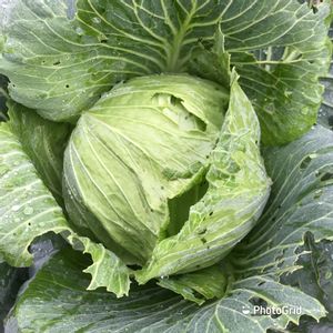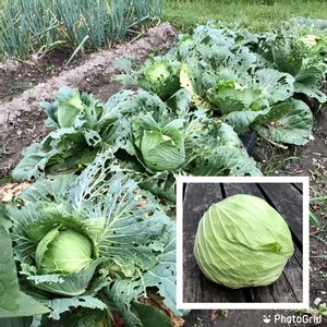 水曜夕方の畑の恵み。初物の極早生夏キャベツ1個を収穫〜😊。高温結球性に優れた早採り品種、🐛に随分やられたが、収穫物は意外ときれいだねー💪。