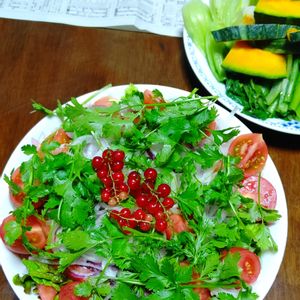 娘たち来訪 パクチーサラダです。 今年旨く出来た玉ねぎとサラダ菜に買ったトマトで
