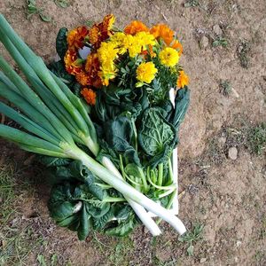 収穫、ねぎ、雪菜、ピーマン マリーゴールド少し