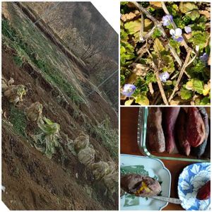 嬉しくなるくらいいい天気 久し振りの畑へ 白菜坊主に、オオイヌフグリが咲いていた。焚火をして焼き芋に、シルクスイートと紅はるかどちらも美味しい