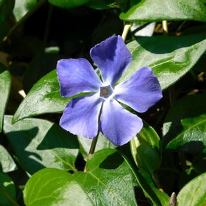 🌿斑入りツルニチニチソウ🌿 3月14日の花散歩にて🚶♀️ 斑入り葉が全体を春らしく爽やかな感じにしてオシャレに見えます💜💚♡🎶 斑入り葉好き♡なので♪♪♪🥰 花の中心は五角形をしていますね♪ もう10年以上前になります、花壇に植えたら、どんどん広がって行って地面を占領するようになり大変な思いをしました😅