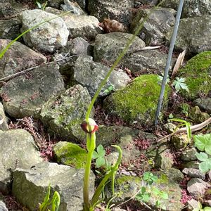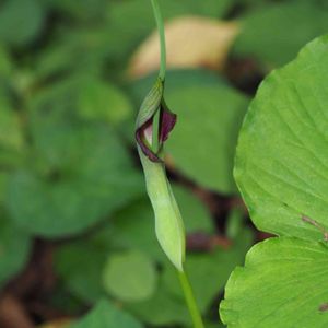 カラスビシャクかなと思ったけど、花の内側が紫色である事や葉が大型で広卵形である事などから、ムラサキオオハンゲだと思われます。 ウラシマソウを小さくした様な可愛らしい花ですね。