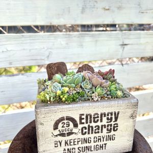 こんにちは😊 先日、投稿した主任への退職祝いの 寄せ植えを見た友達が同じ感じのを是非作って欲しいとご依頼を受け、ワンサイズ小さめで作ってみました。 昨日、木箱プランターが完成したので 今日 早出の仕事から帰ってきて雪のちらつく中、震えながら寄せ植え❄️ 人様からのオーダーなのでドキドキ💓しながら寄せ植え。 喜んでくれるといいな♡