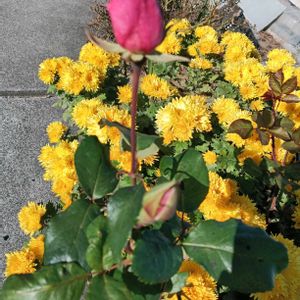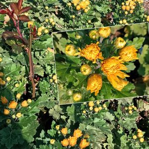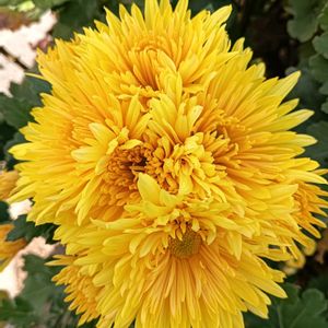 菊です 黄色🟡 名前は?大きく広がっています 小さな紫陽花が陰になり枯れてました😂