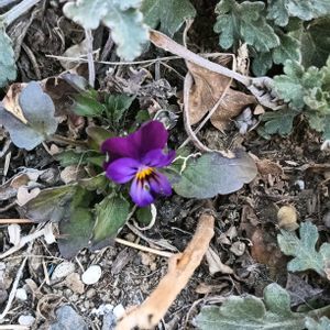 こぼれ種からのビオラです💟💜菊の新芽に 囲まれて咲いてます🤗