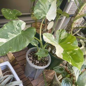 綺麗な三光斑入りのクワズイモです。 柄が蛍光イエローっぽくなってたので写真を撮りました。