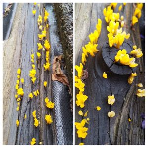 雨が上がって庭に出ると、フェンスの外 雑草避けをしたシート押えをしてる丸太辺りに明るい🟡が視えた。 なんの花?☺️🎶って、 走り寄ってみたら〜〜 ?! 😯😧😦😮😲😳🤯???? これは茸? それとも葉を省いた花?? どなたか、見たことないですか🧐 スターチスの黄色の花のような… フリージアの黄色い花の触感に似ています🍀 かわいい色です🥴💞