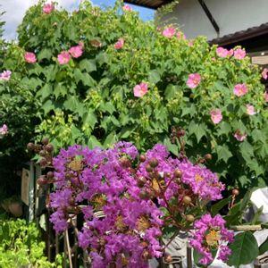 2021.7.25朝 6日の投稿から20日ほど経ったサルスベリ。次々と咲いてまさに百日紅です。背景にこれも夏の花 芙蓉が。