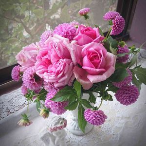 名前わからないけれど😂凄く香りのいいローズポンパドールにちょっと似た子🌹 うなだれていたのでカットしてポンポンダリアと窓辺に🎵 雨でも窓辺が明るくなりました😊💕