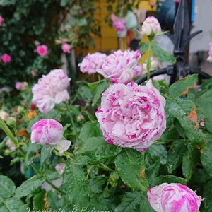 バリエガータ ディ ボローニャ🌹 一季咲きなのに雨だなんて😢 かろうじて夏椿の株本で少しは雨よけ出来てるみたいね🎵