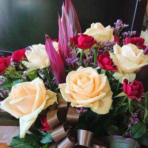 昨日、妹から前倒しのバースデープレゼント💐 テーブルいっぱいになっちゃいそうな花籠💓 ピーチアバランチェ🌹が綺麗~💓