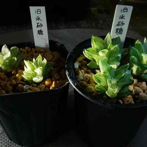 ハオルチア(旧氷砂糖)です。 まだまだ小さいが2芽程脇芽が子吹きしています。。 そう言えば新氷砂糖も子吹きしているな…。