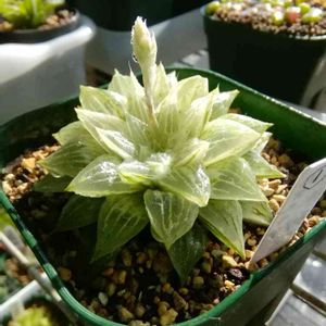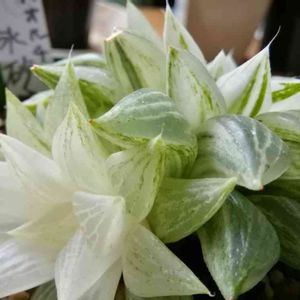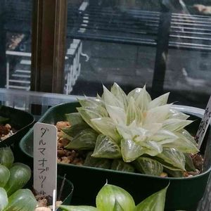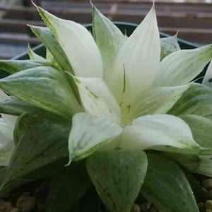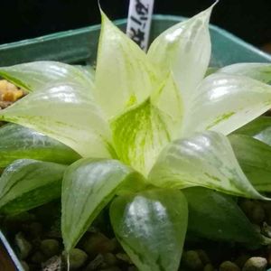 ハオルチア 旧氷砂糖1号 葉の表はほぼ白か透明。葉の裏に線状に緑が入っているので生きている。なかなかきれいな仔を吹く優秀な親株。