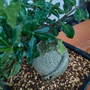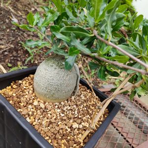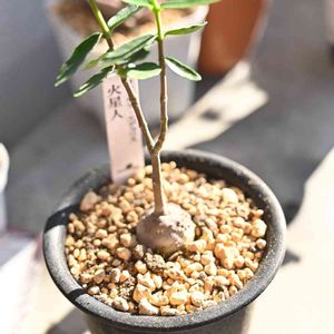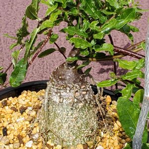 上側の金属っぽい肌の所が、購入した時の苗の地上部。3cm無かった。 鉢増し三回、一年ちょっとでこの大きさに! 次の目標は、開花ですね~