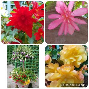 白と紫のフクシアの植木の下にあるお花たち。 こんなに可愛いのに頭が垂れていて、もったいない!! 見に行ってよかった🎶 赤と黄色のお花は、ベコニア? ピンクはわかりません。 リンダーホーフ城庭園にて。