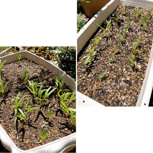 【1枚目】種まき11日目になる空芯菜は双葉が展開して、早いものでは本葉も見えてきました。双葉がチョキ✌️の形なの、可愛い🤭 ちょっと偏っちゃったから多いところから移そうかなと思って直根性かどうか調べたら、空芯菜ってヒルガオ科なんですってね。知らなかったわー😳 植え替えはそーっとやれば大丈夫のようです。そもそも強いからね👍 たくさん発芽したから植え広げる手もありますが、そんなにたくさんあっても食べ飽きるから間引きしようかな😗 【2枚目】こぼれ種を拾った葉牡丹はそこそこ成長しています。 昨日、2cmくらいに成長した青虫を見つけて捕殺しました。危ない危ない💦 昨年のこぼれ種は7月24日には虫に食われ茎だけになって終了しましたが、今年はどうなることやら?🙄 【3枚目】6月26日に葉牡丹リースから救出した葉牡丹は現在こんな感じ。虫に食われてますね💦 どちらの葉牡丹もオルトランDX粒剤はたっぷり蒔いたけどそれだけじゃおそらく間に合わないので、薬剤スプレーも併用するべきなんですがサボってまーす😅 【4枚目】7月7日に種まきした矮性カンナ・サウスパシフィックローズは現在こんな感じ。結構のんびりさん? 9月後半くらいから咲いてくれるかなと思って蒔いてみたけど、ちょっと難しいかもしれません。まぁ咲かなかったら来年に繰り越しで。 【5枚目】7月7日に投稿したミニバラ・グリーンアイスは現在ほぼグリーンになり、背景と同化しつつあります🤭 ちょっとずつ咲き続けていたので枯れたら花首だけカットしていましたが、そろそろ咲き終わりっぽいのでまとめて剪定しちゃおうかな✂️ 今日も暑いですねー🥵 そろそろ葉牡丹の種まき準備しなくちゃですが、こんな暑い中に大丈夫かしら?🤔