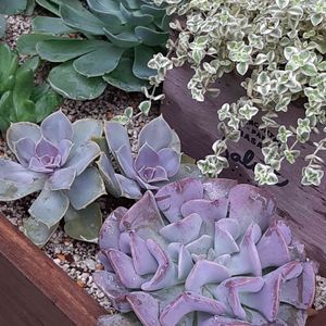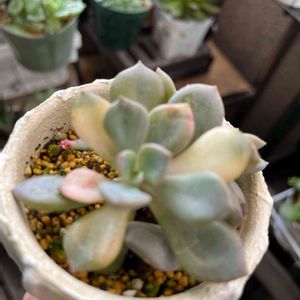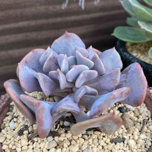 葉挿し苗の少し大きくなった子たちを集めたものです🌸 手前がシャビアナピンクフリル フリル少なめの子ですが、大きくなるともう少しフリルが強くなって来ます😊 奥の子がキュービックフロスト🌸 夏でもピンクで可愛いかった子たちです💕