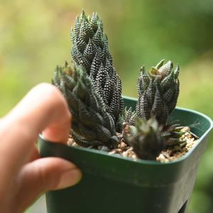 長く伸ばそうと思っていた中央部にあった親株が調子を崩してしまい、泣く泣くカット。 その後、子株たちが勢いづいているハオルチア 黒蜥蜴 カットした親株の先端部分を挿したやつからも根が出たので、 賑やかな群生になりそう