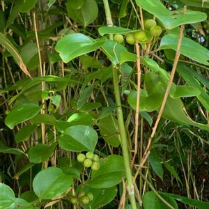 サルトリイバラ わ〜い🤗 実がついている💕 なかなか見つからなくって… 10本に1本見つかるかどうかなのよね😆 ツヤツヤ✨した丸い葉っぱもかわいいわ〜😍 この緑色の実が、味覚糖の「e-maのど飴 マスカット味」そっくりと思うのは私だけだろうか… サルトリイバラ科サルトリイバラ属