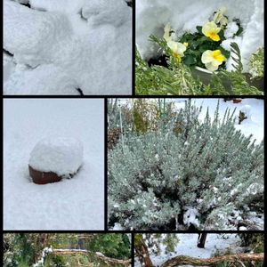 ⛄️昨日の庭⛄️ ↖️ 先日、黄色のコーナー💛と投稿し、皆さんに春らしいね♪と言っていただけた場所。白のコーナーに⁉︎😂 ↗️ 手前のフレンチラベンダー救出後、黄色のコーナーも救出にかかります。まぁまぁ積もってかまくら状態ですね。 ⬅️ 庭は結構積もりました。7号?の植木鉢が埋まっています。 ➡️ グロッソ救出!雪の重みでしなだれていました😣 ⬇️ 事件です!👮🚓 大きなティーツリーの木が折れていました🌲 下のスイセン、ピーーンチ💦