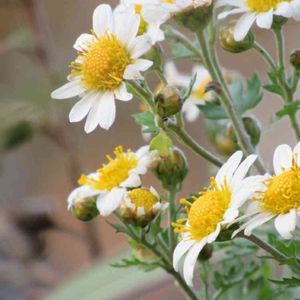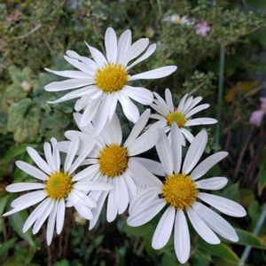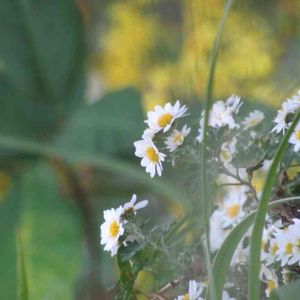 ちょっと遅れて咲く 🎵泡黄金菊(アワコガネギク)🎵 最近咲き始めました、とっても小さいです✨11/12のpicに咲いてなかったので入れなかったコです^ ^ 逆に、こちらはずーっと咲いてる 🎵足摺野路菊(アシズリノジギク)🎵 葉の白い縁取(葉の裏が白)やシルバーの雰囲気が、お花の白とマッチして・・ どちらもずーっと可愛くて❤️増やしてます^ ^ ☆泡黄金菊(ネットから) 別名を京都の自生地の名前からキクタニギクといいます。黄色の花が泡のように密に咲くので、泡黄金菊(アワコガネギク)の名が一般的になりました。また別名としてアブラギクとも呼ばれますが、別種にアブラギクと呼ばれるものがありますから大変紛らわしくなります。 東北地方から四国、九州に広く分布し、山野の崖地、小川の縁などの日当たりのよい場所に多く自生しています。茎は多数叢生し、直立して上部ではよく分枝しています。広卵形の葉は、5深裂し、裂片の先は縁に欠刻状の鋸歯があります。葉の質は薄く両面に毛があります。開花時期は10~11月、よく分枝した茎の上部に1.5cmほどの黄色い頭花を密につけます。 中央には多数の黄色い筒状花が集まり、周囲には5~7mmの黄色の舌状花が一列に並んでいます。 学 名 Chrysanthemum indicum 科 名 キク科 利 用 部 位 頭花 利 用 法 開花中の頭花を緑の総苞をつけたまま採取し、日干しします。開花時期が遅いので、乾燥にはカビないように注意すること。 乾燥花20gをゴマ油200ccに漬け、2ヶ月ほどたってから使用します。必要時に応じて、この油を脱脂綿につけて患部に塗ります。花はつけたままにしておき常備薬に。 効 能 消炎⇒火傷、切り傷、打撲傷 成 分 精油の芳香成分:アルファ・ツヨン ⭐︎足摺野路菊(アシズリノジギク ) 学名 Chrysanthemum japonense var. ashizuriense - ノジギクの葉は生育域によって変異が見られるそうです。 これは高知県の足摺岬や愛媛県などに分布。ノジギクに比べて葉は小さく厚く、3中裂する。裏には白い毛が多く表のふちが白い。頭花は小さくて多数つき、総苞片にも白毛が密生する。 追記 朝ドラ「らんまん」
