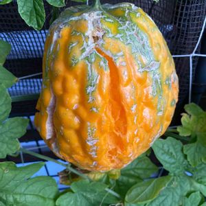 アップルゴーヤ 緑秀 最初になったゴーヤです😆🎶 GSで熟したゴーヤをジャムにしてると聞いて、どうしても中の実の回りのゼリーを食べてみたくて熟成させていました。 亀裂が入り昨日収穫😁🎶