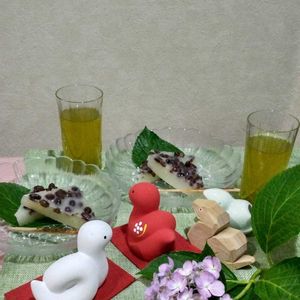 🏷️和菓子の日 🏷️月曜日は元気色の花 ① 紫陽花 夏越祓(なごしのはらえ) 今年の干支の巳さん達 集まりましたよ さぁ 水無月 召し上がれ 前半年の穢れを祓い 後半年気分良く過ごしまし ょう ② 紫陽花と水無月 ③ 柏葉紫陽花 お焼きも頂きましょう ④⑤黄色いお花は元気貰えます