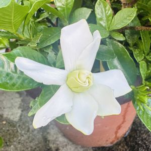 クチナシの一番花𖧷 ⁺. 去年、母の日にもらった花。 昨日、帰ったら咲いてた。 良い香りに、疲れた心が少し癒やされた。 ➡4日目の柏葉紫陽花