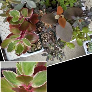 カランコエ 外の反日陰で とても元気です この子は多肉ちゃん? 赤白の斑入りで 花はまだですが華やかです 💚💕💚💕🎵🎶💚
