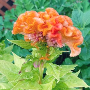 おはようございます♡ ケイトウෆ̈ෆ̈ෆ̈ 鮮やかなオレンジ色🍊の 不思議な形のお花が咲きました 少し赤い色も混じっていて可愛い〜 明るい葉色も爽やかで綺麗です🧡🍃