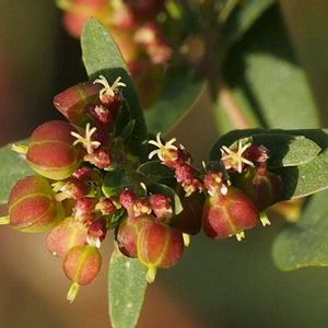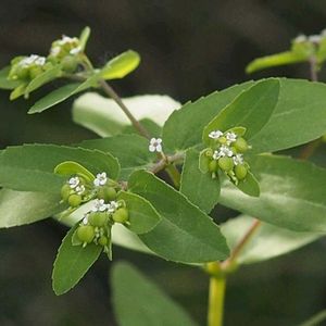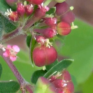 大錦草(オオニシキソウ) トウダイグサ科ニシキソウ属の一年草。明治時代末の1904年に侵入が確認された北アメリカ原産の帰化植物。各地で野生化し道端などで普通に見られる。茎は淡紅色を帯び、直立または斜上して高さ20〜40㎝になる。葉は対生し長さ1.5〜3.5㎝の長楕円形で、基部は左右が非常に不揃い。花期は6~10月。杯状花序は枝先にまばらにつく。腺体は円形。腺体の付属体はよく発達し、白い花びらのように見える。果実は蒴果。直径約1.7㎜の卵球状で無毛。種子は3個あり黒褐色でゆがんだ卵形。 ある毒草の本に『きれいな花には毒がある』というが、『きれいでなくても毒がある植物がある』と酷評されているのがこの植物である。全草に毒成分であるマクラトールやβ-シロステロールが含まれる。生汁が肌につくと皮膚炎を起こすことがあり、誤食すると粘膜がただれる。 ニシキソウの葉と茎によく似ていて、大きい草姿なことが名前の由来。ニシキソウは地面を這うように生える日本在来種で、かつては普通に見られたが、コニシキソウなどの帰化植物に押されて、現在では5都市で絶滅危惧種に指定されている。 出典『野に咲く花』『日本帰化植物写真図鑑』『帰化&外来植物見分け方マニュアル 950種』『植調 雑草大鑑』『草木の種子と果実』『薬草の呟き』『野草の名前 秋冬』