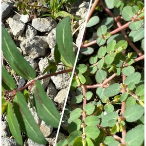 おはようございます。 砂利の中に生えていたのがオオニシキソウ(左) ハイニシキソウ(右)です。 茎から白い液体が出るので、チチクサと呼んでいました。