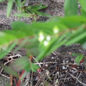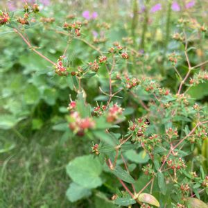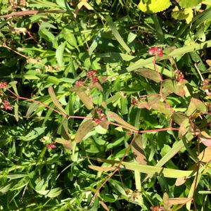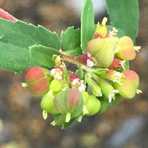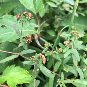 トウダイグサ科の一年草 大錦草 北アメリカ原産 帰化した地域では雑草として知られる 花期は6-10月 直径1.7㎜のルビー📍 杯状花序は枝先にまばらにつく 果実は直径約1.7㎜の卵球形で無毛 地面近くに生えていた雑草です。小さな赤い玉がコメツブみたいなルビーのようでした😊