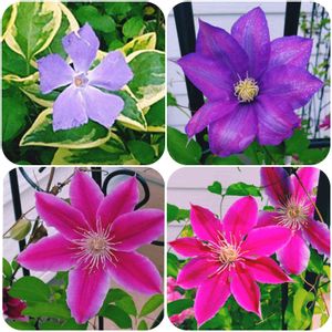 おはようございます🖐😊🐓☀️ ↗️のクレマチスのHFヤングサンが3年ぶりに咲きました🤗💓 元は↖️のニチニチソウサンのような色でしたが、2年前地上部全枯れから復活してくれたので良し👌とします😊 ↘️のドクターラッペルサンは縁取りが無いお花が咲きました😊 ↙️少し薄いですが、縁取りがあります😍