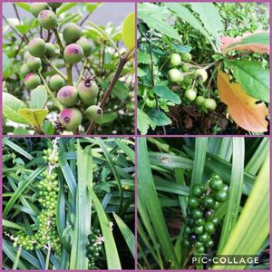 こんばんわ🍀 秋になり、お花が実になりました。💞 上の右は、千両、左はシャリンバイです。🌿 ムーさんに教えていただきました。💐 下の2つは、ヤブランです。💖