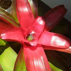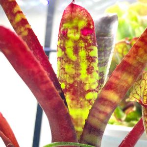 名前は分かりませんが2年以上育ててる ネオレゲリア。 肉眼だと素晴らしく鮮やかな 赤なんですが私のスマホでは・・😅 葉っぱが焼けないギリギリで太陽☀️に 当ててます😊 やはり置き場はベランダが一番かと 思ってますが、 強風で葉っぱがめちゃくちゃこすれる のだけが気になる😓