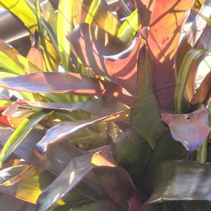 娘が誕生日にバイト先の店長から頂いた観葉植物。 ブロメリアの一種と思うけど、名前は不明。 分かる方、教えて下さい。🐧