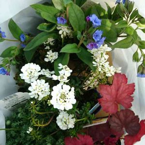 今日仕入れた草花、2つに分けて寄せ植えにしようと思います🌿🌻 花ほたる&エンジェルクローバー(グロリアス) 宿根イベリス&プルモナリア&ヒューケラ(ジョージアピーチ)