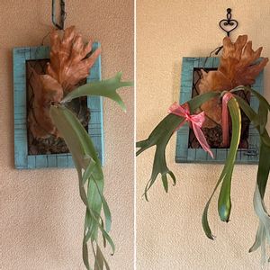 ビカクシダのオモの貯水葉が初めて二枚重なるようになりました。 左の貯水葉が初めは胞子葉を避けるような異形をしていたので、邪魔な部分の胞子葉と貯水葉を切り取ったところ2枚目の貯水葉が綺麗に覆い隠してくれました🙏☺️ 貯水葉がトサカみたいになるタイプでした🐔