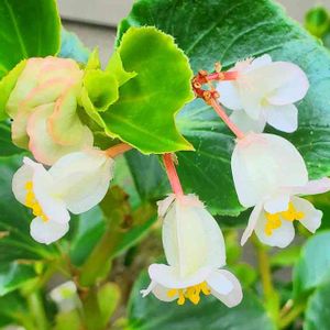 おはようございます♪ ♡今日のお花♡ 💕秋海棠(シュウカイドウ)💕 シュウカイドウ科 ベゴニア属 多年草 雌雄同株異花 🌸雄花…まず雄花が咲き、花茎が2又に分かれて新たな雄花が咲き…を3〜4回繰り返して最後はその先端に雌花を下向きに咲かせます 4枚の花弁のように見えるが左右の小さな2枚が花弁で大きな2枚は萼です、黄色い球状の雄蘂が目立ちます 🌸雌花は三角錐のような子房がついてます 葉は左右非対称の♡ハート形です ネットで検索しました