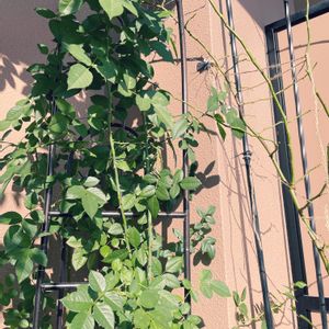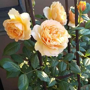 ラベルポー 壁際で咲かせたくてハーフアーチに誘引したら、うまいこと伸びてくれて叶いそうです🧡